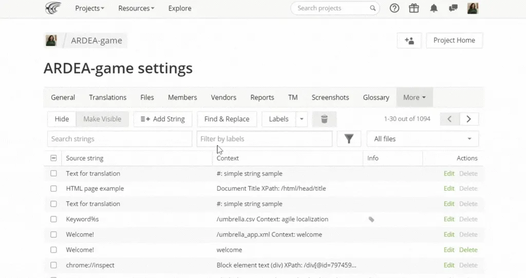 Labels will help you group project strings by specific parameters or topics. Labels give translators more context, help filter out the specific translatable content in the Editor, or when creating tasks for translation or proofreading.