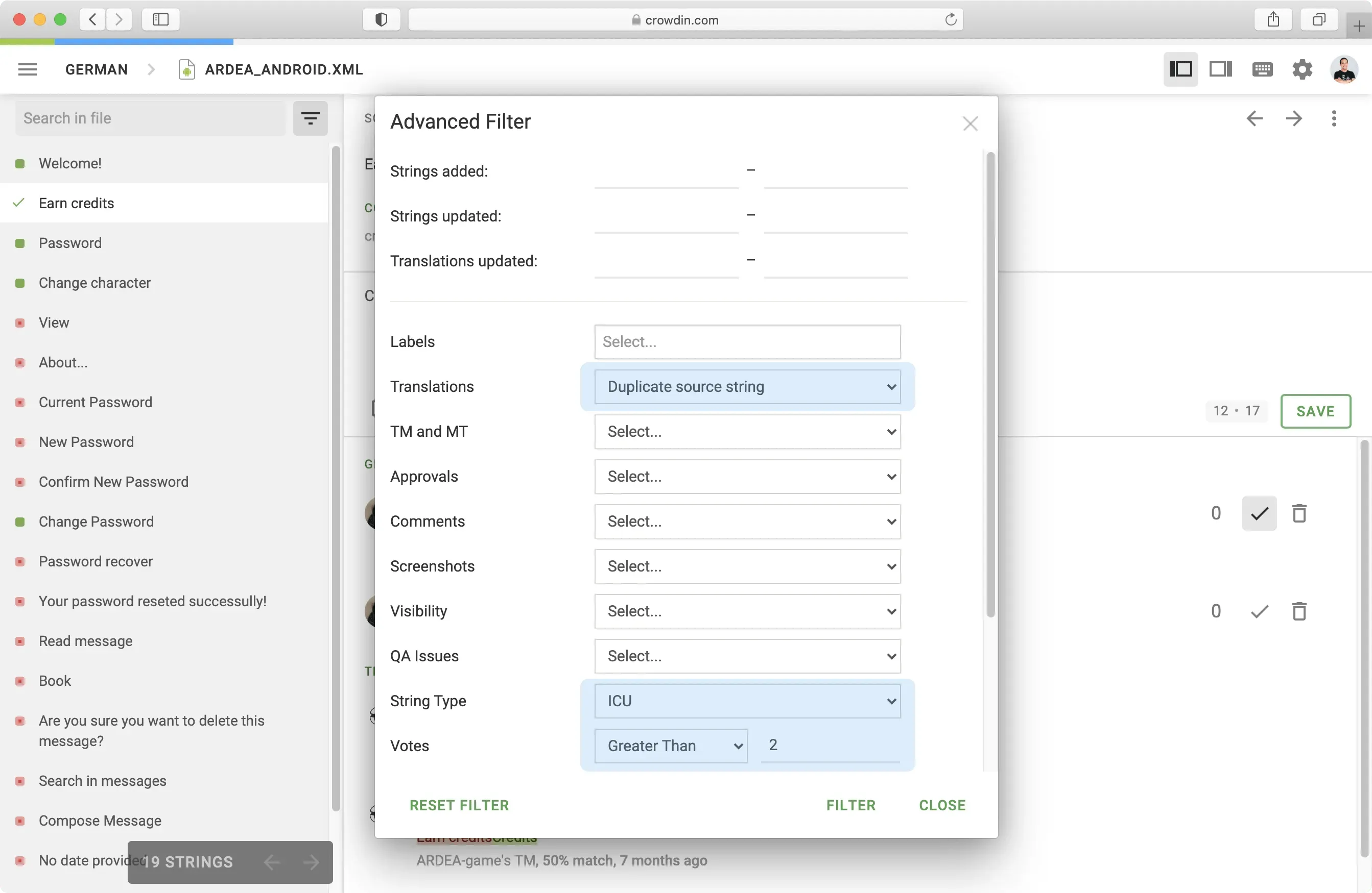 You can now find strings where source equals translation, filter translations based on the number of votes it received, as well as sort out strings with plurals or ICU syntax.