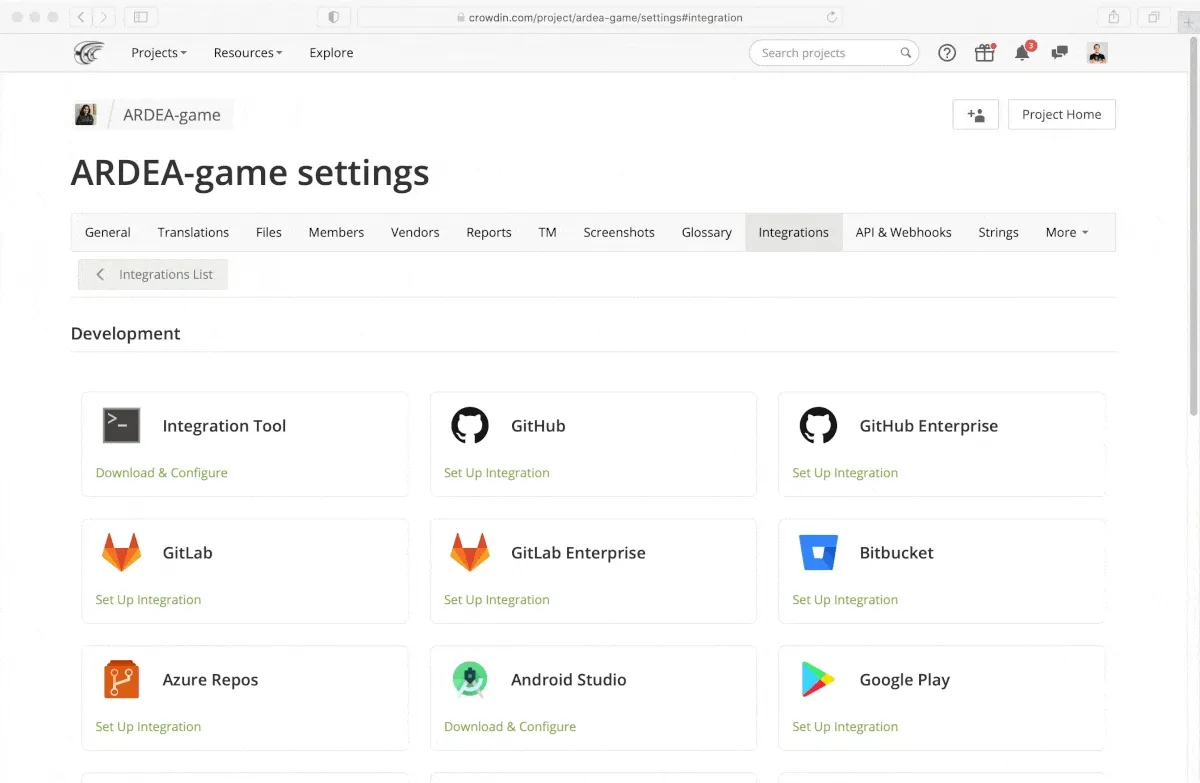 The Integrations tab within your Crowdin and Crowdin Enterprise projects has a new look. Now it’s a grid, instead of a list. You can now find the necessary integration faster and open its settings on a separate page.